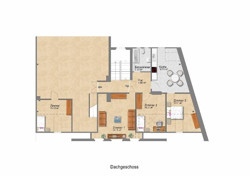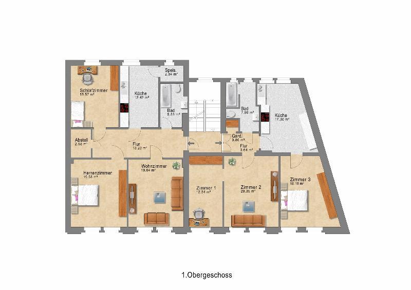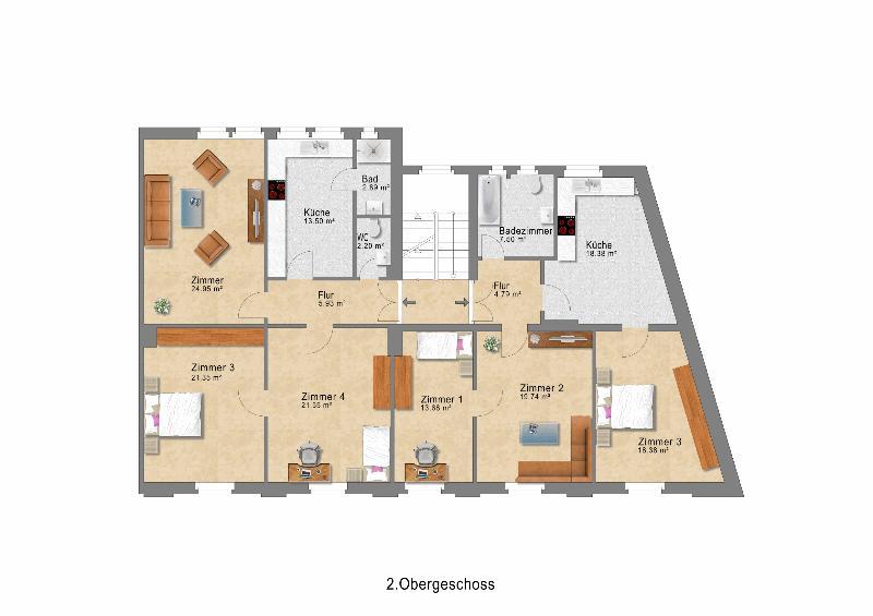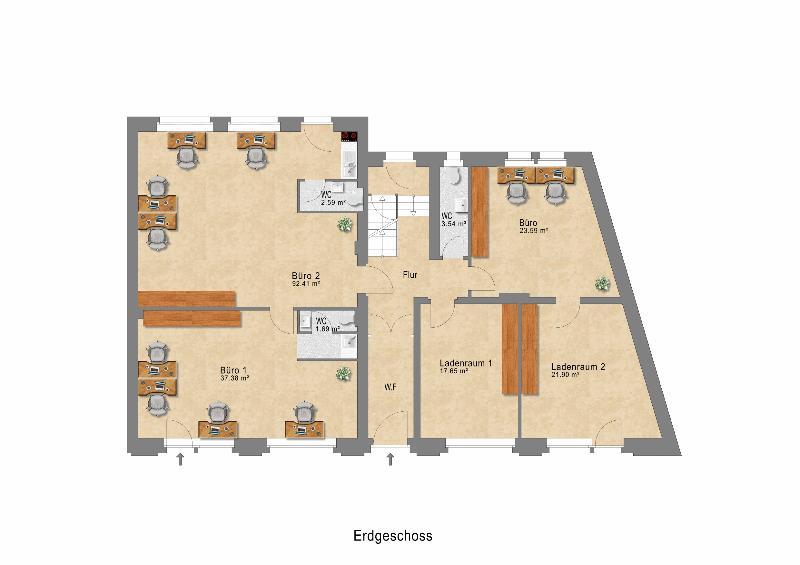 Die Immobilie teilt sich auf in 2, bereits langjährig vermietete Gewerbeeinheiten im Erdgeschoss und 5 Wohnungen auf den drei Etagen darüber. Insgesamt steht eine Vermietbare Fläche von 589 m² zur Verfügung. Die beiden Wohnungen im 1. Obergeschoss wurden in den letzten Jahren modernisiert.