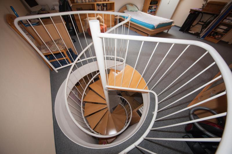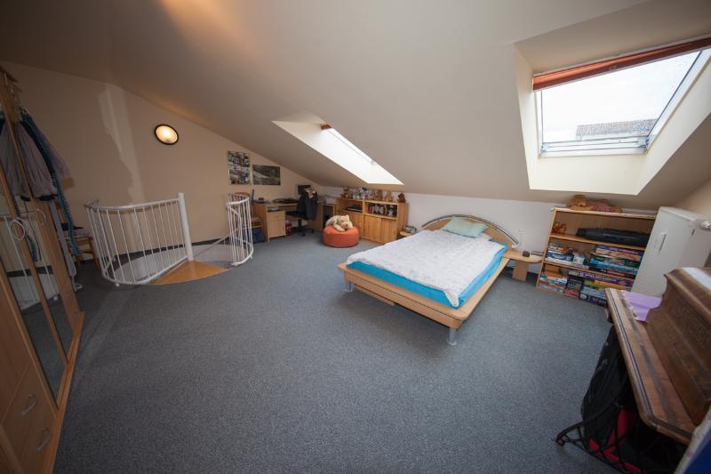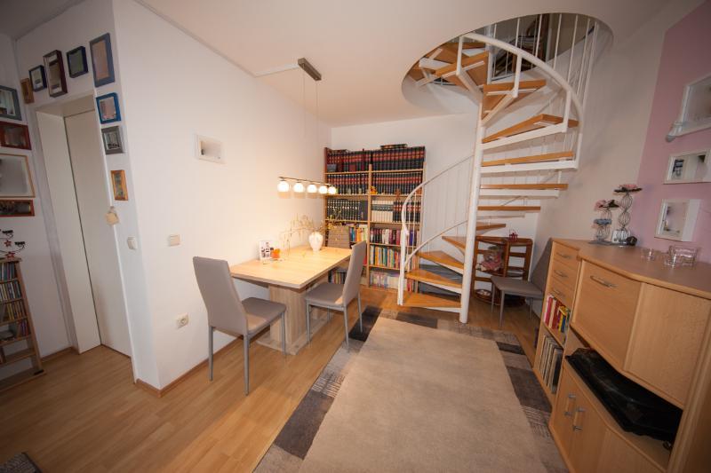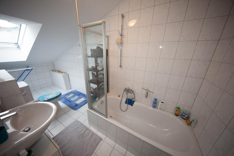 Auf der unteren Etage befinden sich das helle Wohnzimmer mit Zugang zum Balkon, eine separate Küche, ein großzügiges Schlafzimmer sowie ein Gäste-WC. Im Dachgeschoss stehen ein weiteres geräumiges Schlafzimmer und ein gepflegtes Badezimmer zur Verfügung. Alle Räume überzeugen durch ihren großzügigen Schnitt.